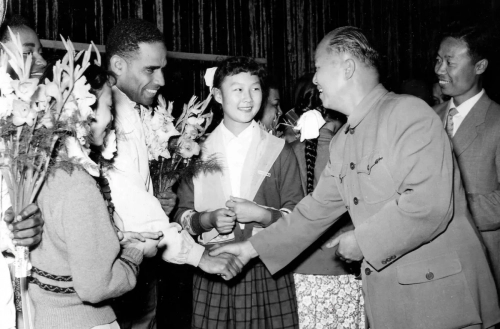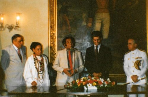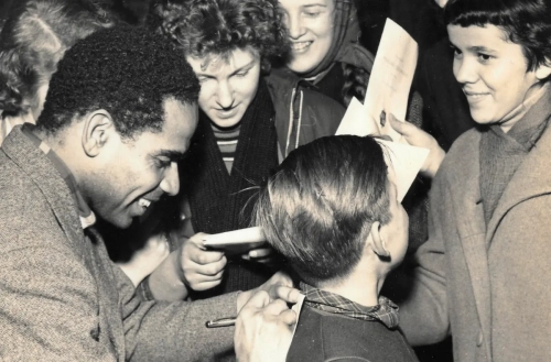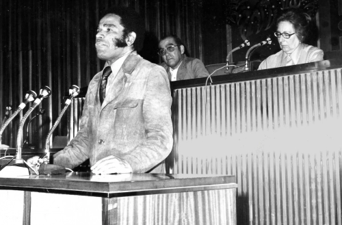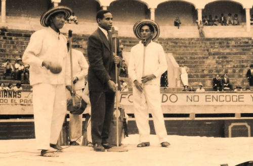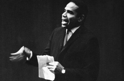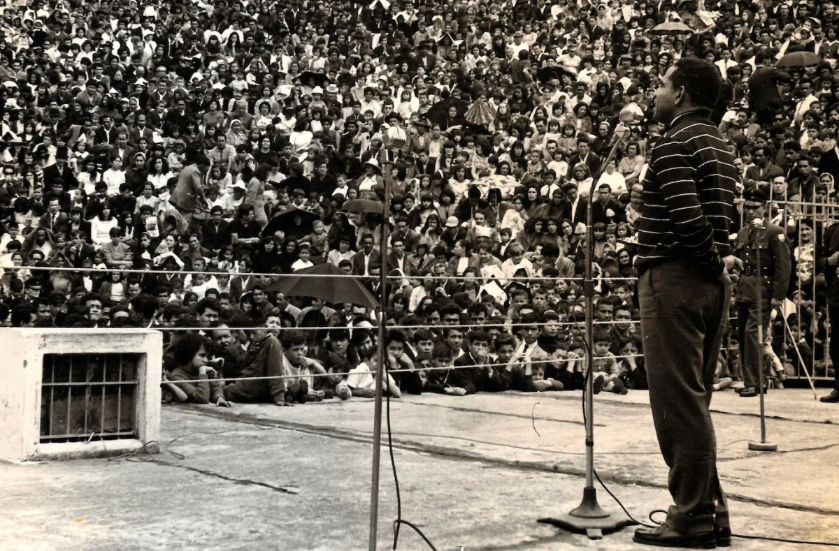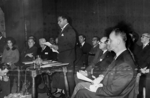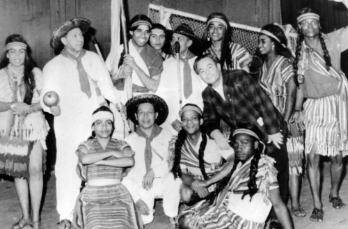 Manuel Zapata Olivella en la Media Torta en Bogotá. Sello: FOTO BENAVIDES, MARQUETERÍA, SERVICIO A DOMICILIO. 5 MAYO 1968. Carrera 44 No. 68A-16, Tel. 517933